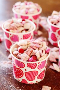 In two gallon size ziplock bags, put ½ cup strawberry cake mix and ¼ cup powdered sugar in each bag. Dump each bowl of chex mix in each bag and shake until coated with the powdered sugar and strawberry powdered cake mix.